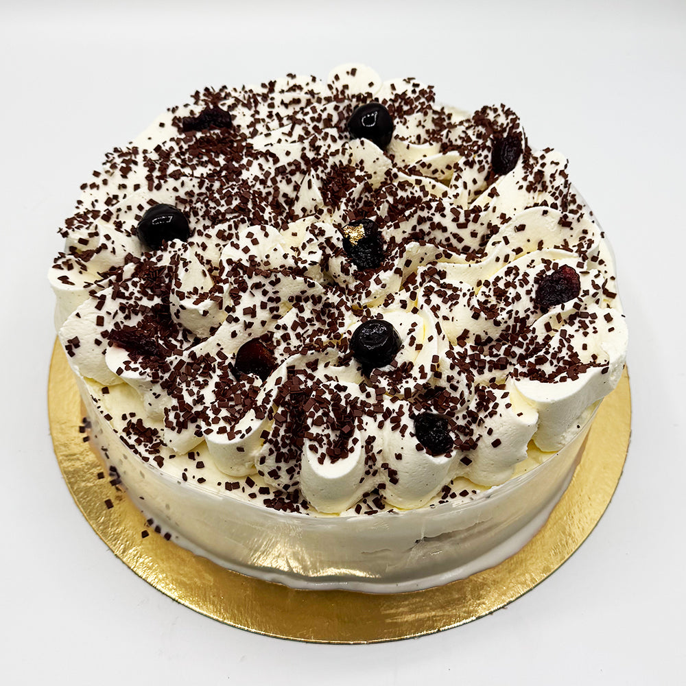 Une génoise imbibé de jus de griotte, une ganache montée au chocolat, une crème fouettée et quelques griottes.