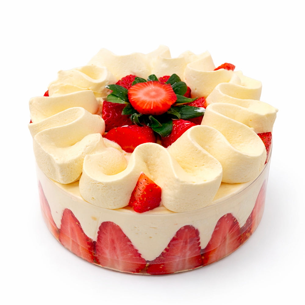 Mangue - Fraise : biscuit vanille, croustillant vanille, ganache montée mangue et insert fraises.